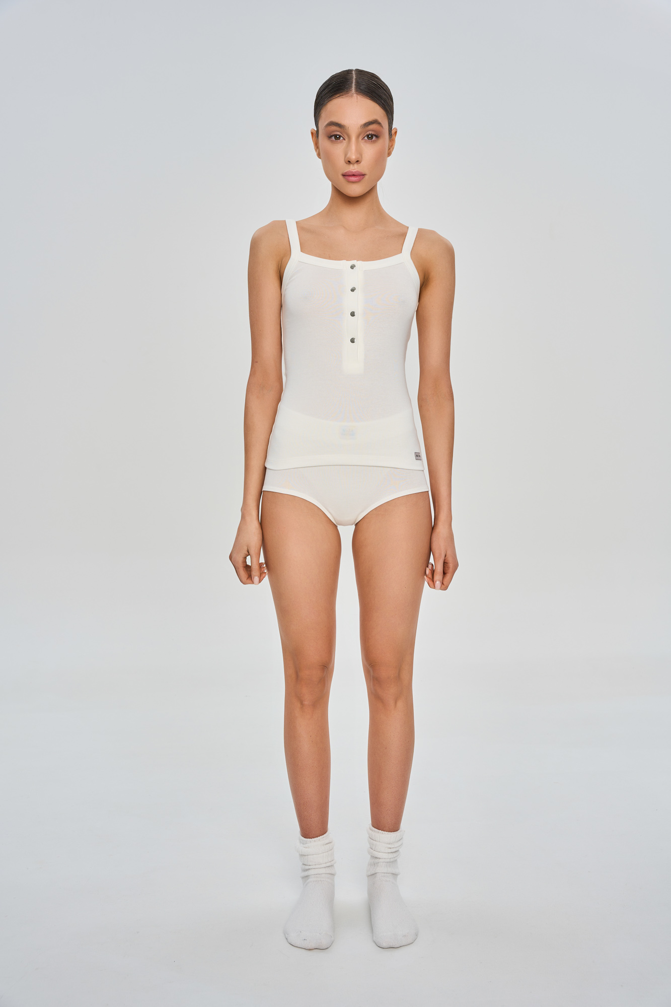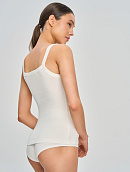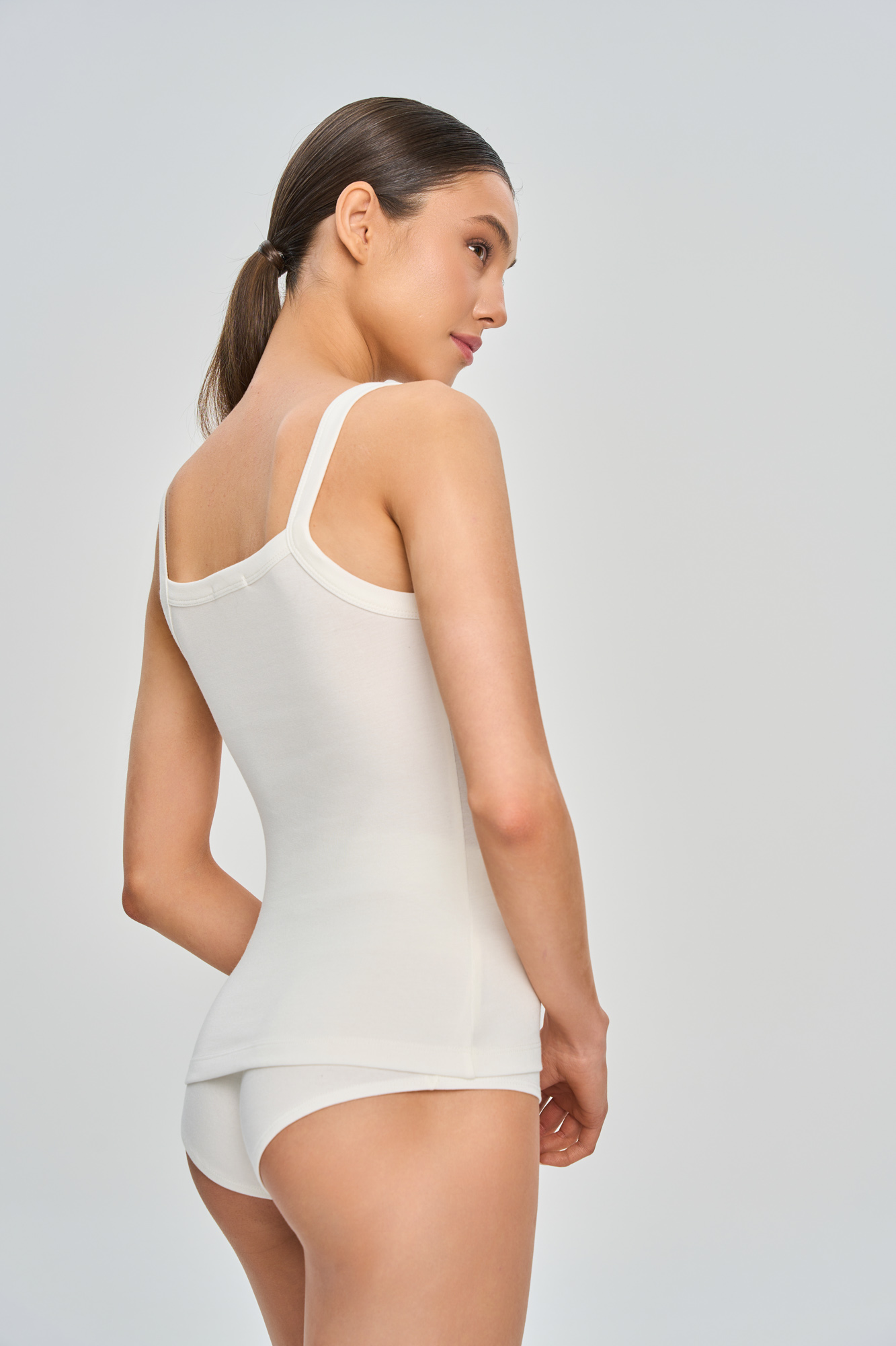 Майка на тонких бретелях из мягкого эластичного полотна в состав которого входит сертифицированный органический хлопок.