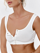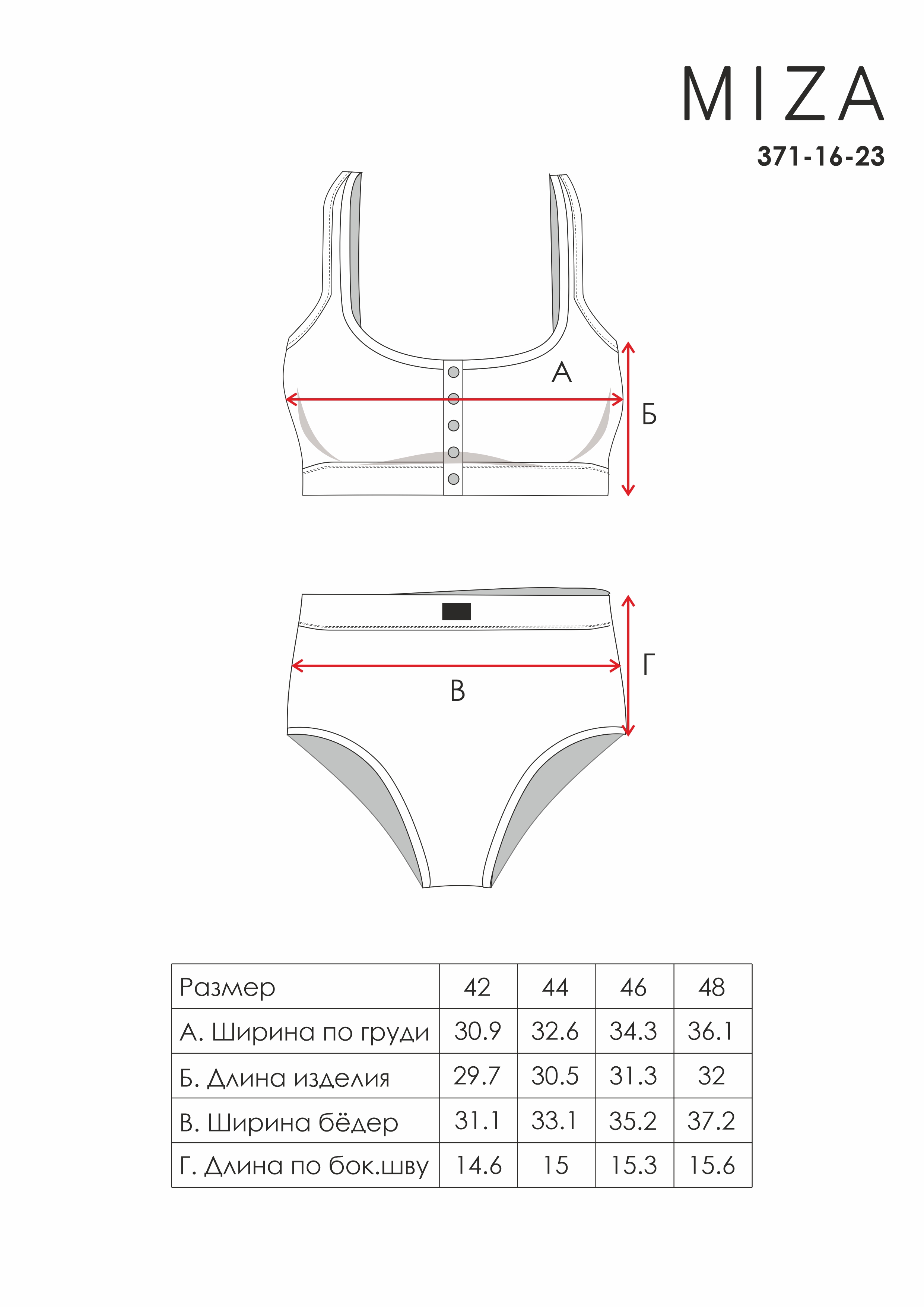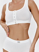Комплект состоит из бралетта на широких бретелях с застежкой на кнопки и трусиков с высокой посадкой на талии, оформленных нашивкой.