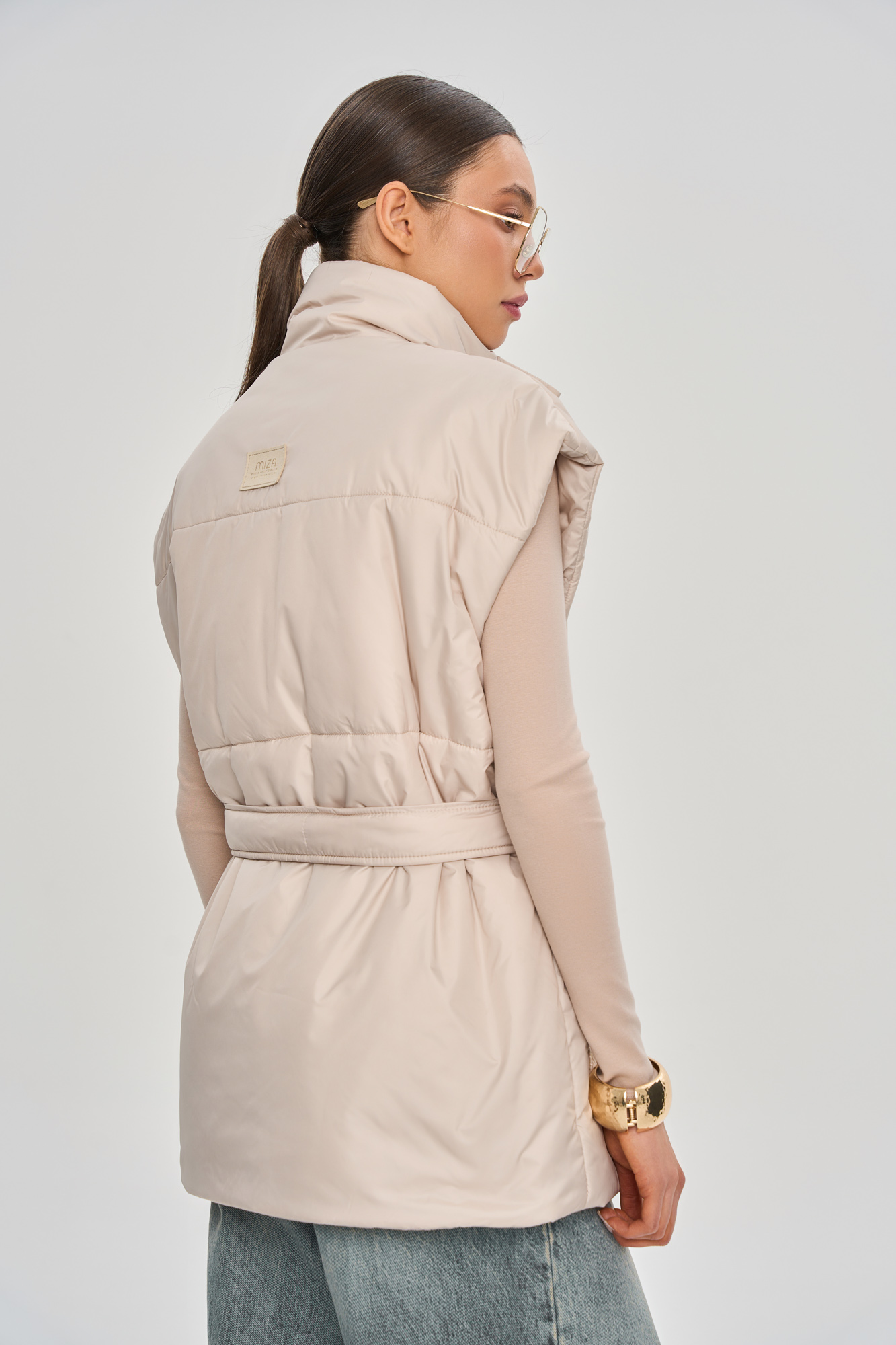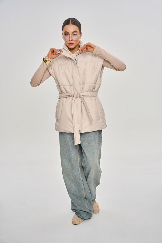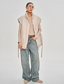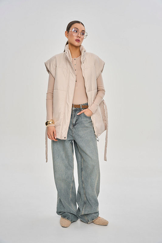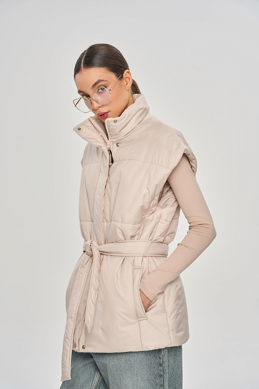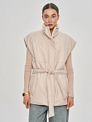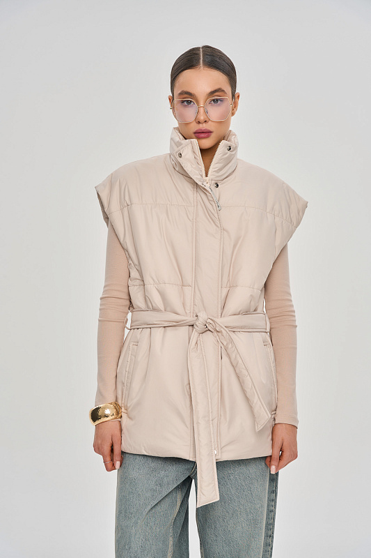 Удлиненный жилет прямого кроя свободного силуэта, со съемным поясом.